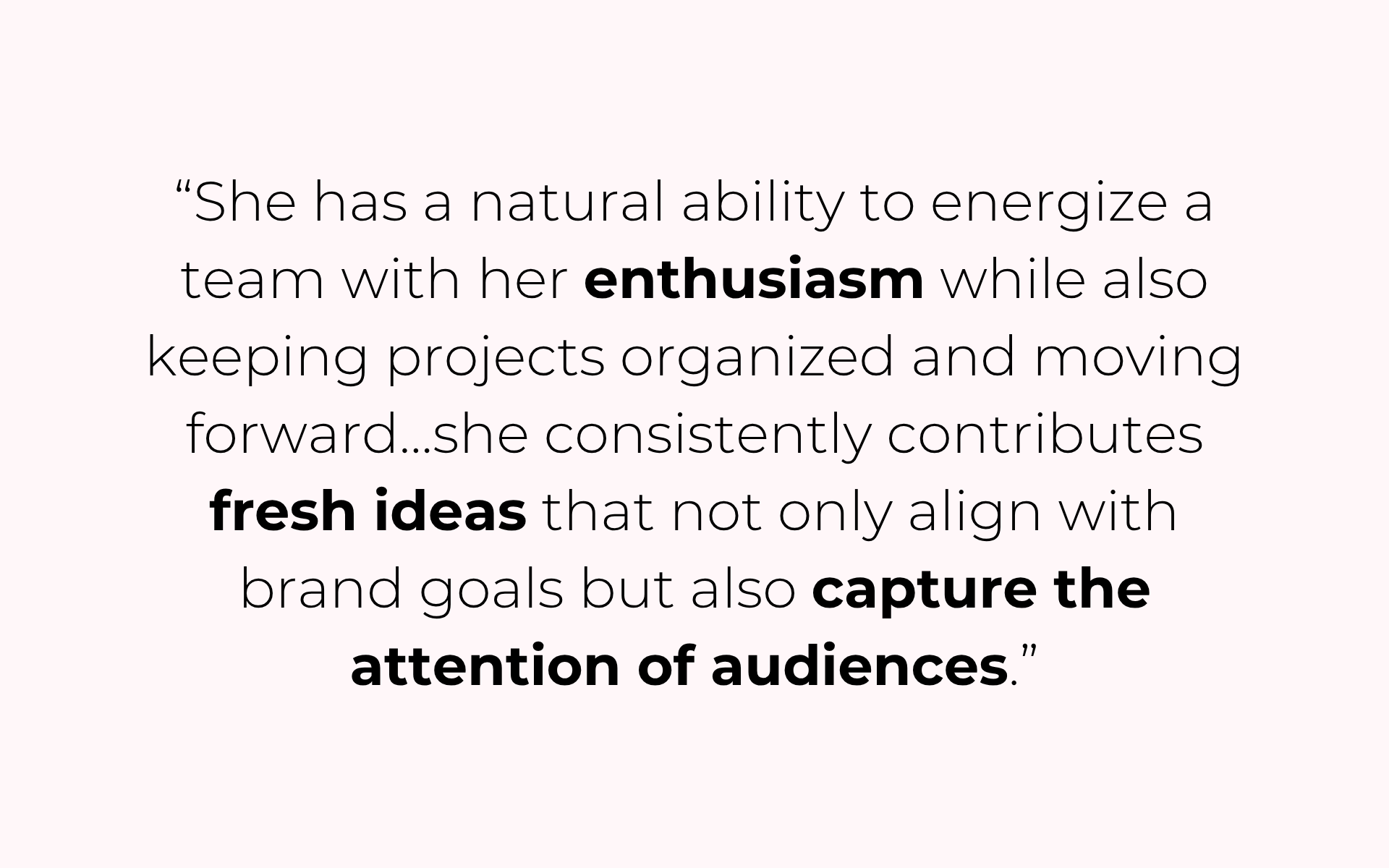 My work with these brands has spanned marketing strategy, creative direction, social media management, content creation, brand development, influencer partnerships, paid advertising, marketing event planning, collaborations, UGC campaigns, and more!